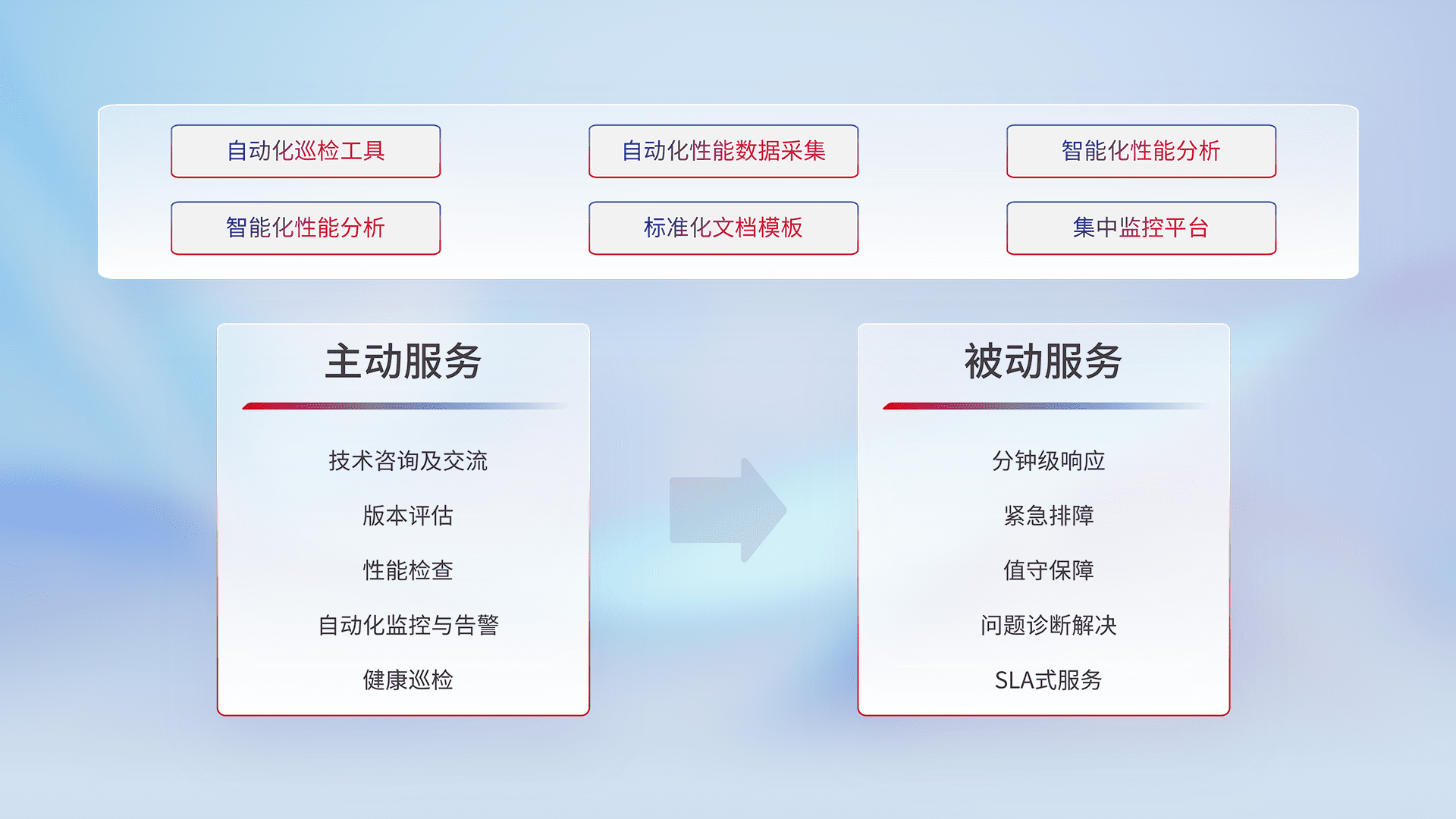 智能化工具和标准化文档,,,,保障服务质量,,提供主动服务(包含技术咨询、、版本评估、、、、性能检查、、、、自动化监控与告警、、、、健康巡检)和被动服务包含(分钟级响应、、紧急排障、、值守保障、、问题诊断解决、、、、SLA服务)。。。。