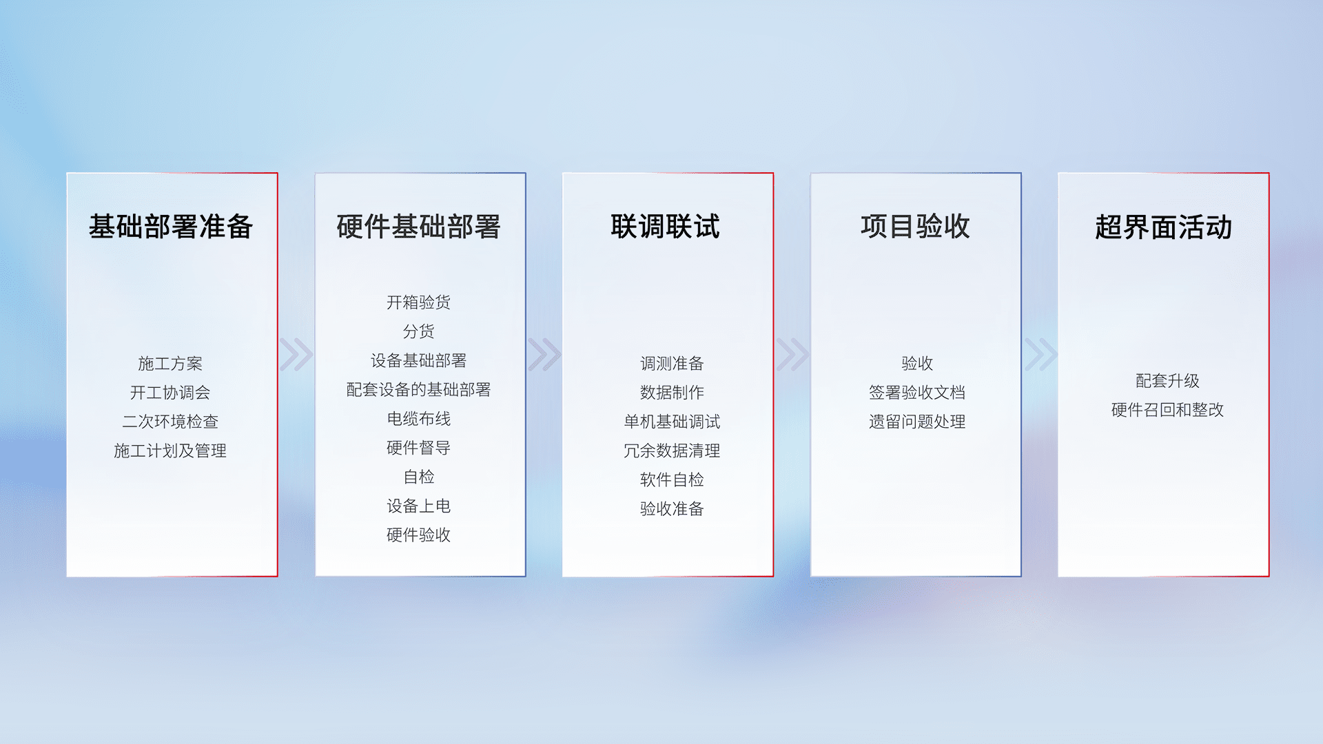 从基础部署准备、、、硬件基础部署、、联调联试、、、、项目验收、、越界面活动的全过程可追溯,,,保证施工质量和进度。。。。